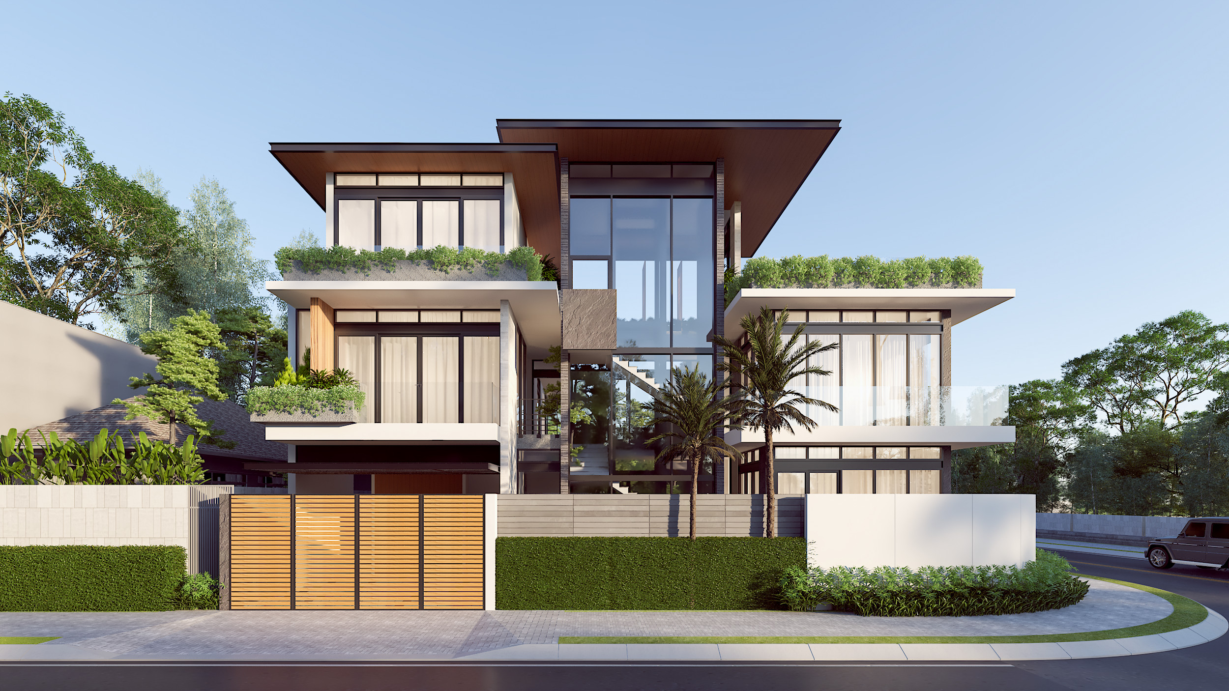 Mô tả dự án: Dự án được lấy cảm hứng từ những căn nhà Châu Âu. Chủ đầu tư muốn căn nhà được thoáng mát, sáng sủa. Hình khối mạnh mẽ, tối giản. Các chất liệu sử dụng cho dự án được lấy từ thiên nhiên như gỗ, sỏi, đá, gạch .... Những ô lam gió lớn giúp căn nhà vẫn đảm bảo được sự riêng tư nhưng căn nhà vẫn đối lưu thông giớ tốt.